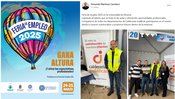 Responsables, técnicos y administrativos de distintas áreas de CALDERERÍAS INDÁLICAS se trasladaron a la feria con el fin de ofrecer prácticas y empleo a las personas con formación universitaria, siendo esta una gran oportunidad para mantener “in situ” un contacto directo entre todas las partes: estudiantes, personas tituladas y empresas ofertantes de empleo, como es nuestro caso.